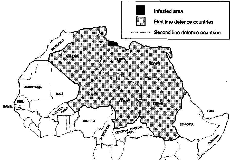 The Natural History Museum in London was also designated by FAO as the Reference Laboratory for Screwworm and Animal Myiasis. The Laboratory has been exchanging information on screwworm and myiasis with more than 20 countries in Africa, countries that hitherto have had little data on wound myiasis. Prevention being better than cure, surveillance in Africa has been both intensive and extensive, well beyond the borders of Libya. Countries under surveillance have been divided into two categories: six high risk (front line) countries and 11 second line countries (see Figure 2). Surveillance activities have included the establishment of check points, livestock movement control, animal inspection, sample collections, prophylactic spraying and public information. By mid-1991 no NWS has been detected in these areas.
