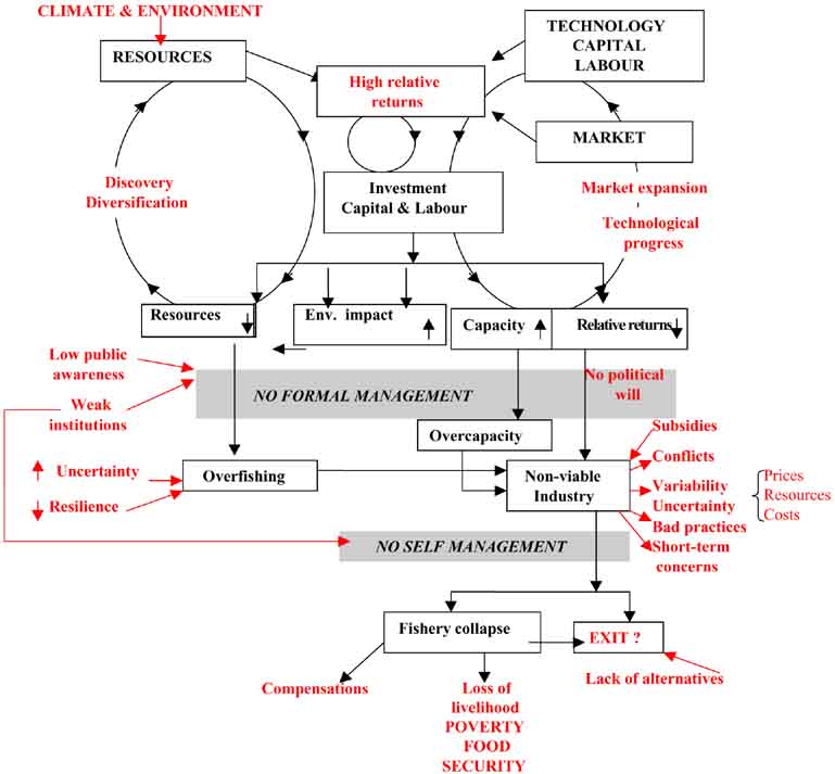 These higher relative returns in the sector will, if there is no management, put pressure on the sector by attracting capital and labour into the fisheries. This increase in capacity results in higher exploitation of the resource that leads to a reduction in the resource biomass. In terms of economics this results in lower catches relative to the invested capital and applied labour, and thus lower returns. As a side effect, increased capacity will lead to increased environmental impacts in terms of by-catches and impacts on the habitat. Furthermore, as the resource is being more exploited, uncertainties about its state and productivity may increase and environmental variability will result in larger variability.