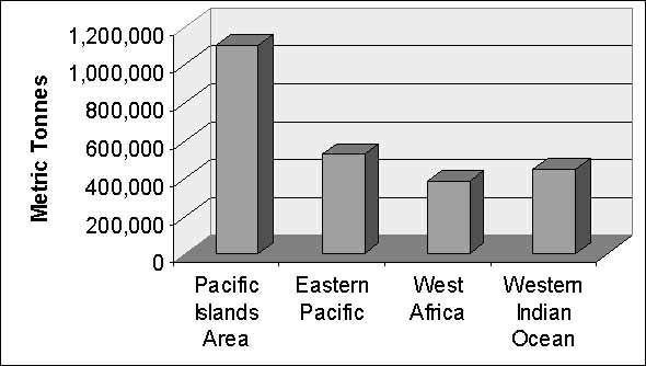 Figure 3. shows that skipjack is by far the main species caught, and catches increased by 80 percent over the past decade. In 1999, skipjack catches reached a peak of almost two million MT.