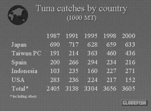 Taiwan (Province of China) more than doubled its catch during the years under review from 190 000 MT to 460 000 MT in 1998, but also Taiwan (Province of China) experienced a decline in 2000. Noteworthy is the increase in tuna catch during the years under review of Indonesia (+130 percent). The loss of the tuna fishing grounds in the Central Eastern Pacific due to the tuna dolphin issue led to a substantial decline in US tuna production, down almost 50 percent