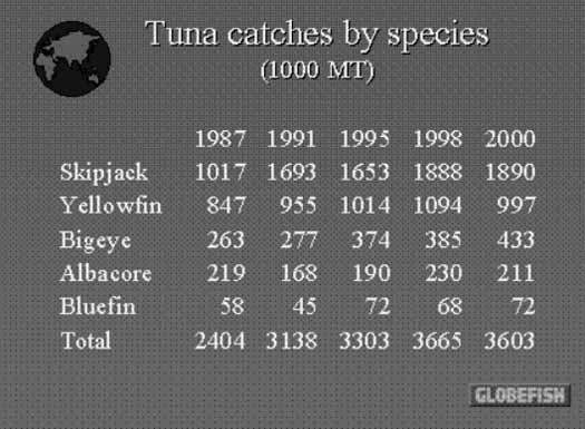 The biological aspects of the fishery are thoroughly reviewed in Dr Fonteneaus paper in this document. In more general terms, Figure 5. indicates that catch reduction has been successful, but the source, GLOBEFISH, does not provide such scientific details. However, it also indicates that bluefin and bigeye are under stress. This is reinforced by scientific advice provided to regional fisheries management organizations. For example, the Scientific Committee of the CCSBT advised in October 2002 that at a global catch of about 15 500 tonnes there was an equal probability that the bluefin stock could decline or improve. It was acknowledged that at current catch levels there is little chance that spawning stock will be rebuilt to the 1980 levels by 2020.[57]