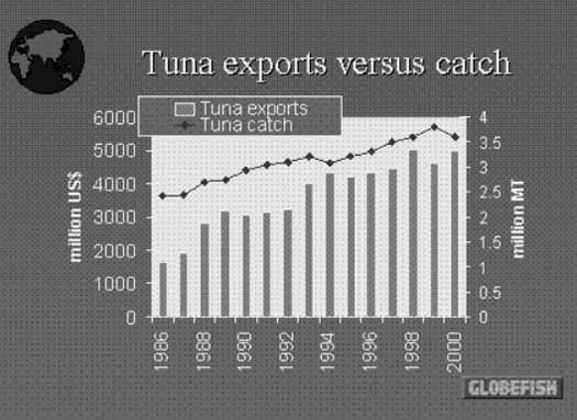 The graph in Figure 4. compares the growth in tuna catch (in quantity terms) with the growth of tuna exports (expressed in value terms). It can be noted that trade expanded more than catch, reflecting increase in value of both fresh and frozen tuna in recent years. It has to noted, however, that the trade figures have not been adjusted for inflation. In 1999, the oversupply of tuna shows that while catches reached a record of 3.8 million MT, the total value of tuna trade was lower than in 1998 or 2000.