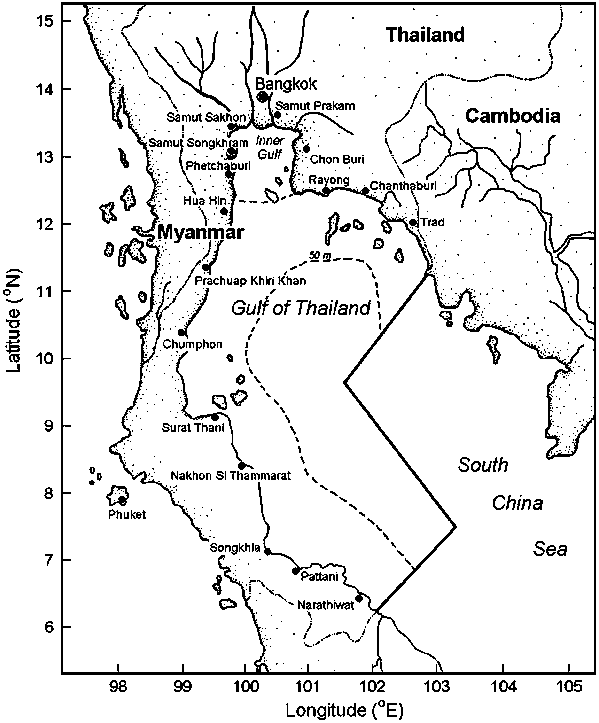 With an area of about 350 000 km2, the GoT is a typical Large Marine Ecosystem (LME) in term of its size (Sherman and Duda 1999). However, it differs from a number of other LME in being, to a large extent, part of the EEZ of a single country (Fig 1), thus minimizing straddling stocks issues. Moreover, the GoT appears largely unaffected by the massive regime shifts that beset other areas of the Pacific, e.g., the Central/North Pacific (Polovina et al. 1995). These features lead to a situation where ecosystem effects of fishing can be evaluated in pure form, as it were, without having to account for the confounding effects of, e.g. foreign fleets operating within the GoT, or environmental fluctuations. This review is therefore focused on Thai trawl fisheries operating in the GoT.