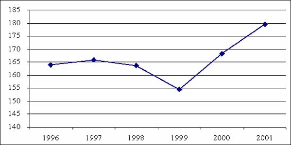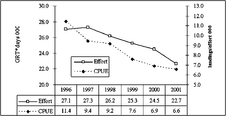In the period 1996-2001, effort registered a reduction of 16 percent, against a much higher reduction of CPUE, estimated around -42 percent, denoting a deterioration of the exploitation pattern. As it is evident from the figure 2, CPUE shows a continuous downward slope for the whole period. But, as for the period 1999-2001, there is an inversion and the rate of reduction of CPUE is strongly decreasing, showing that measures introduced in the industry proved to be positive and can be considered as a contribution to the solution of the bio ecological component of sustainability due to an efficient management action, involving a high participation from fishermen.