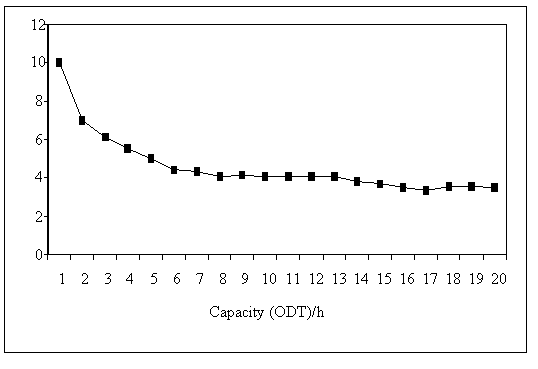 The exchange rate ruling at the time Figure 5 was prepared was 1ECU equivalent to US$1.15. At this exchange rate, the production costs for crude bio-oils (excluding feedstock costs) are of the order of US$4.60/GJ. With the calorific value of a barrel of crude oil (159 liters) ranging between 5.03 and 6.35GJ (Anon, 2000) the cost of producing bio-oil with the same calorific content as that in a barrel of crude oil is of the order of US$23 to US$29. However, this is the cost with free feedstock. In addition to the processing cost there is also likely to be a cost associated with the feedstock used by the process – if only the cost associated with the collection of up to 160,000 OD tonnes per annum at a single site.