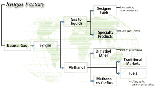 Liquid fuels (in particular methanol and petroleum) can also be produced from gasification products via processes that are currently employed on natural gas (Anon, 1979; Solantausta et al, 1994). The cost of manufacturing methanol from a large-scale wood gasification/methanol plant would, based on New Zealand work from the late 1970s (Anon, 1979), be currently of the order of US$18/GJ. While methanol could be used in its own right as a liquid transport fuel, it can also be converted catalytically into gasoline (Isaak & Hoffman, 1983). That would add US$18/GJ (or US$362/tonne) to the methanol cost, should it be required. This cost may be contrasted with the current cost of premium grade petrol (tax excluded) of some US35c/litre (IEA, 2000a), or equivalently US$7.7/GJ. Similarly, this may be contrasted with the international price for bulk methanol from natural gas, which currently ranges between US$200 and US$270 a tonne (www.methanex.co/methanol.currentprice.htm). That is, biomass methanol is at least a third more expensive than methanol from natural gas or, on a dollars/GJ of energy basis, more than twice as costly as petroleum derived gasoline.