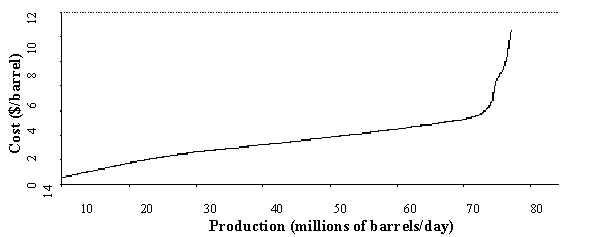 At present the total cost of finding and producing oil ranges from around US$3 to US$12 per barrel (Anon, 2000). Although it is difficult to determine an average world production cost for oil, it appears that the average cost for much of the world’s present supply (including amortization of capital and exploration outlays) is less than US$6 per barrel (Anon, 2000a). That cost, in real terms, would appear to be less than that reported two decades ago (Isaak & Hoffman, 1983) and perhaps serves to highlight the differences between the real world and that applying in a model.