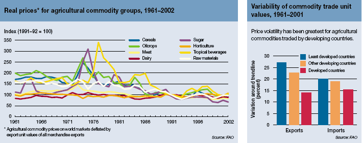 Many LDCs rely heavily on a few commodities whose prices not only have fallen sharply but have been highly erratic, further complicating economic planning and development. Over the past 40 years, prices have been most volatile for tropical beverages and raw materials - the same commodity groups that have experienced some of the steepest long-term declines. Overall, variability from trend levels has been highest for agricultural commodities traded by LDCs and other developing countries and has been lowest for agricultural products traded by developed countries, both for exports and for imports.