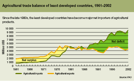 Over the course of the past 40 years, the net flow of agricultural commodities between developed and developing countries has reversed direction. In the early 1960s, developing countries had an overall agricultural trade surplus of almost US$7 billion per year. By the end of the 1980s, however, this surplus had disappeared. During most of the 1990s and early 2000s, developing countries were net importers of agricultural products. FAO has projected that this agricultural trade deficit is likely to widen markedly.