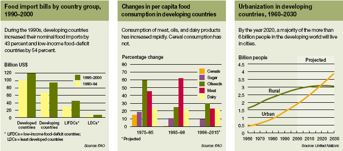 According to United Nations estimates, the world's urban population is expected to increase by 70 percent over the next three decades. Most of this growth will take place in developing countries, particularly in Africa and Asia. As recently as 1985, almost 70 percent of the population in developing countries lived in rural areas; by the year 2020, more than half of these 6 billion people are expected to live in cities. Their higher incomes and urban lifestyles are likely to bring about further changes in the structure of global imports, accelerating the trend towards higher-value and processed foodstuffs.