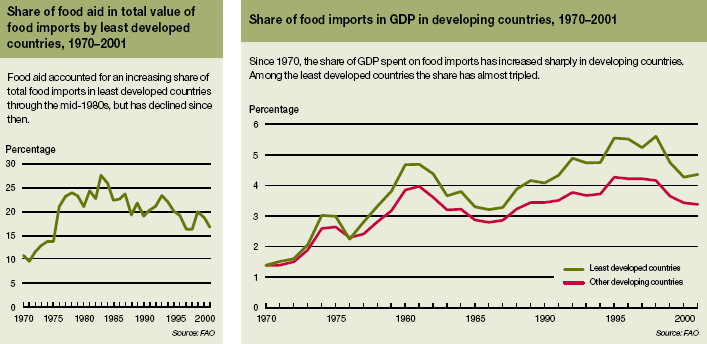 In addition to spending an increasing share of their GDP and foreign exchange earnings on food imports, LDCs are also major recipients of food aid. When less food aid flows to countries that suffer from food shortages, it might be expected that commercial food imports would increase - and the data tend to confirm that this is the case.