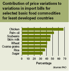 The results of a study of a sample of important food commodities - wheat, coarse grains, rice, sugar, chicken, skim milk, soybeans and palm oil - reveal consistent differences among commodities in the relative importance of price and quantity variation in determining changes in food import bills. The contributions of the variations in import prices to import bills ranges from around 35 percent to nearly 70 percent. The contribution of price variations is significantly (in statistical terms) lower for basic staples (such as sugar, rice, coarse grains and wheat) than for those products with higher price and income elasticities (such as chicken and palm oil). This implies that food import bills for staple foods in LDCs are more influenced by variations in domestic production that prompt adjustments in imports to satisfy domestic basic food consumption needs. For instance, a large negative shock to domestic staple food production, given the high self-sufficiency in basic foods of most LDCs, translates into a large increase in demand for imports. Given the inelastic food-security consumption needs of LDCs, such large increases in import demand are not influenced greatly by international prices. From a policy perspective, these findings suggest that measures designed to address instability in domestic markets for basic food staples may play a relatively greater role in reducing instability in their food import bills.