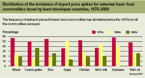 Although the number of price spikes has diminished for many basic food commodities since the 1970s, many LDCs have suffered from extreme price volatility, with a large number of spikes in the prices of basic food commodities they must import to ensure the food security of their population.