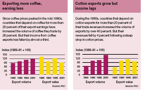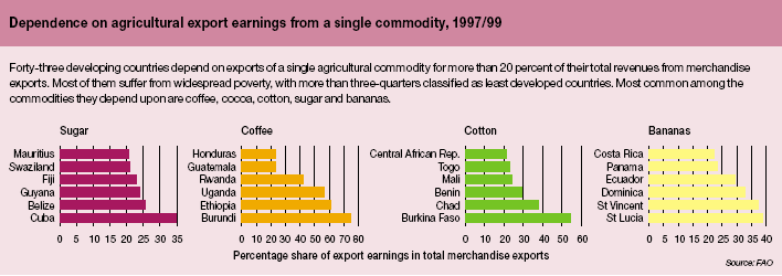 Many developing countries depend on exports of a small number of agricultural commodities, even a single commodity, for a large share of their export revenues. This concentration leaves such countries highly vulnerable to unfavourable market or climatic conditions. A drought or a drop in prices on the international markets can quickly drain their foreign exchange reserves, stifle their ability to pay for essential imports and plunge them into debt.