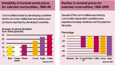 Furthermore, recent data show that few of the countries concerned are reducing their commodity dependency. In 14 of the countries, dependency on a single agricultural commodity actually increased between 1986-88 and 1997-99, and only seven countries succeeded in reducing their reliance on a single commodity. Over the past 20 years, real prices for many of the commodities these countries depend upon have fluctuated widely and fallen significantly overall (see page 11).