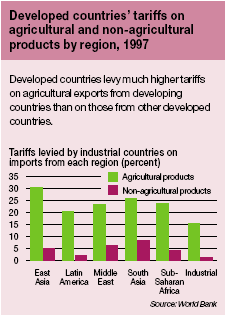 According to FAO estimates, if tariffs were reduced by 40-60 percent in developed countries and 25-40 percent in developing countries, with tariff peaks being subjected to the biggest cuts, agricultural exports of LDCs could increase by as much as 18 percent.