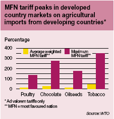 Average tariffs faced by developing countries may be low, but "tariff peaks" that are substantially higher than the average are applied for a number of the commodities they export, such as sugar and horticultural products. For each commodity group, the developed countries have more tariff peaks and higher average peak tariffs than the developing countries. According to the WTO, the highest tariff peaks on agricultural imports in developed countries are as high as 350 percent for tobacco, 277 percent for chocolate, 171 percent for oilseeds, and 134 percent for poultry.