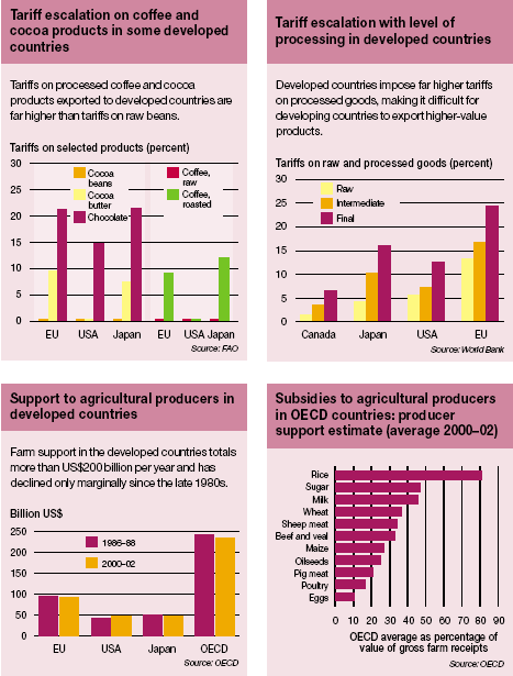 The food-processing industry includes some of the highest levels of tariff escalation and tariff peaks. Tariffs on fully processed foods in many cases are more than double the tariffs on the basic food commodities. This is seen as one reason for the limited involvement of developing countries in exporting processed products. Another recent study by FAO found that for developing countries about 57 percent of agricultural export earnings came from processed agricultural products compared with 68 percent in developed countries. For LDCs the share of processed products in agricultural exports amounted to only 20 percent. However, tariff escalation discourages investment in agricultural processing in developing countries and blunts efforts to reduce dependence on primary commodities and diversify into more highly valued products. There are, of course, other reasons, including domestic supply constraints and entry barriers arising from concentration in international markets, which discourage vertical diversification into the production of value-added forms of commodities by developing countries.