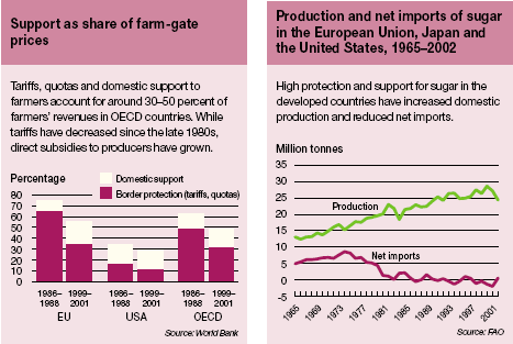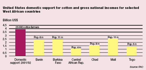 More than 10 million people in Central and West Africa depend on cotton production for their livelihoods and food security. For many countries in the region, cotton exports provide the main source of foreign exchange revenues and rural employment. In 2001, cotton accounted for more than 50 percent of the total agricultural exports and 2.5-6.7 percent of the GDP of Benin, Burkina Faso, Chad, Mali and Togo. Working small plots of 1-2 hectares and relying on manual labour, farmers in West Africa rank among the lowest-cost producers of cotton in the world. Since the mid-1990s, however, they have been battered by a collapse in cotton prices and by competition with cotton exports from the United States. Production costs in the United States are three times higher than those in West Africa. But United States cotton farmers also benefit from US$3-4 billion per year in direct support - more than the entire GDP of Burkina Faso, where 2 million people depend on cotton production. Between 1998 and 2001, as cotton prices slumped to record lows, cotton production in the United States grew by more than 40 percent and the volume of exports doubled. The collapse of cotton prices is estimated to have cost eight West African countries nearly US$200 million in lost annual export revenues. The cost to millions of rural households for which cotton is the only source of cash income has also been high. One recent study by the World Health Organization found that West African households that grew cotton in addition to maize had better nutrition and higher incomes. When cotton production grew by 175 percent between 1993 and 1998, poverty decreased by 16 percent. Cotton subsidies in the developed countries are not the only reason that cotton prices have fallen for domestic producers in some developing countries. In some cases, domestic policies have also penalized cotton producers. Moreover, technological change and competition from artificial fibres have been pushing the world cotton price down over the past 50 years. However, a study by FAO suggests that eliminating all domestic support - not only support notified to the WTO - would increase world cotton prices by 5-11 percent, and would prompt an expansion in African exports of at least 9 percent and possibly as much as 38 percent.