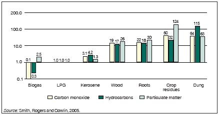 Figure 1 shows the emissions of major toxic pollutants from fuelwood per meal in typical cookstoves in India, relative to the most common clean fuel available, liquefied petroleum gas (LPG). The two wood species measured (Acacia spp. and Eucalyptus spp.) produced some 25 times more small particles than LPG, with other biomass fuels producing even more. Studies comparing emissions from hardwood and softwood species are not available from developing countries, although anecdotal accounts suggest some differences. Studies in the United States and other developed countries (e.g. Fine, Cass and Simoneit, 2002; Environment Australia, 2002), however, have suggested that hardwood species generally have somewhat lower emissions than softwood species for combustion in fireplaces, which may provide the closest comparison with typical stoves in developing countries. Differences by species, however, are unlikely to be significant compared to those resulting from other parameters affecting human exposure, such as fuel moisture, burning rate, ventilation and cooking behaviour.