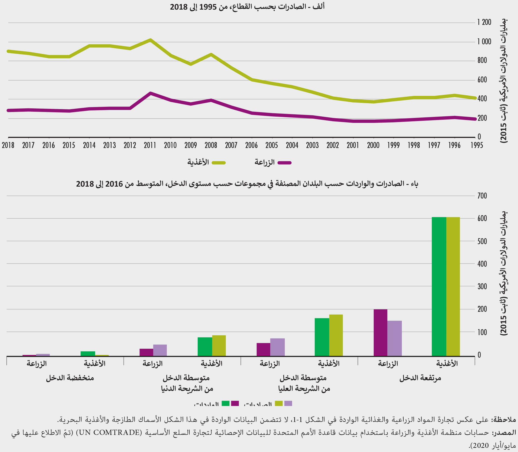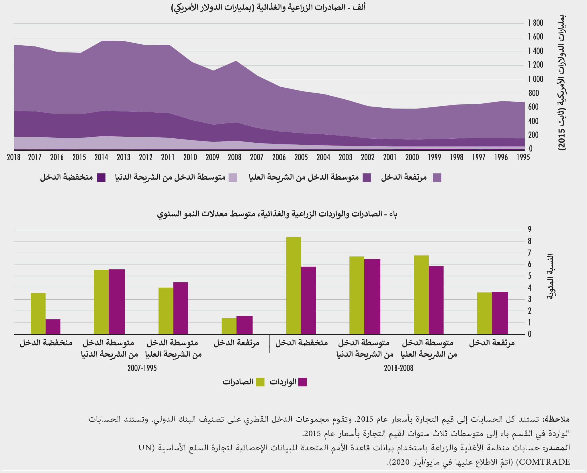 1.1 تطور تجارة المواد الزراعية والغذائية، 1995-2018 (تصنيف البلدان في مجموعات بحسب مستوى الدخل)