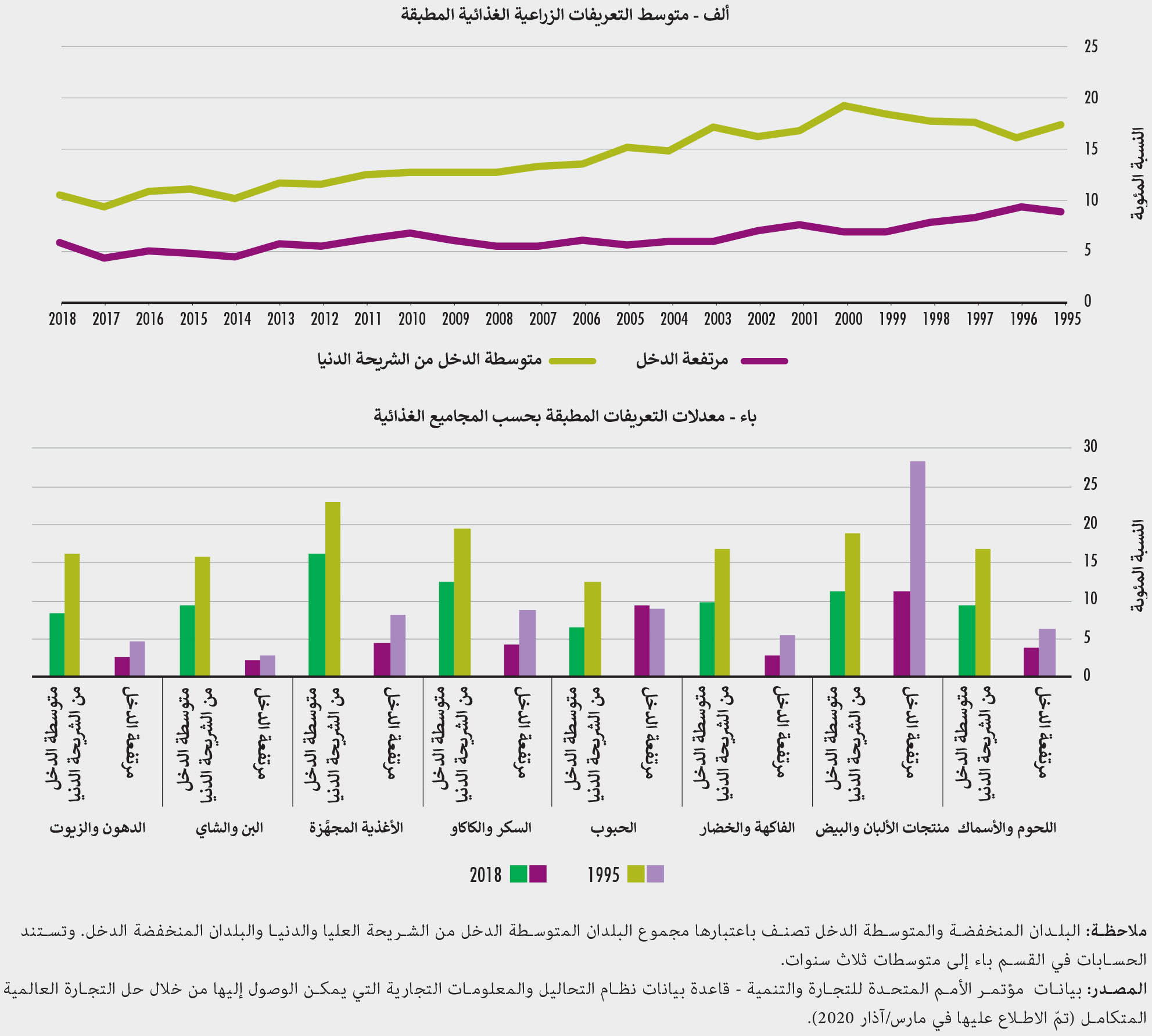 12.1 معدلات التعريفات الزراعية المطبقة، 1995-2018 (تصنيف البلدان ضمن مجموعات بحسب مستوى الدخل)