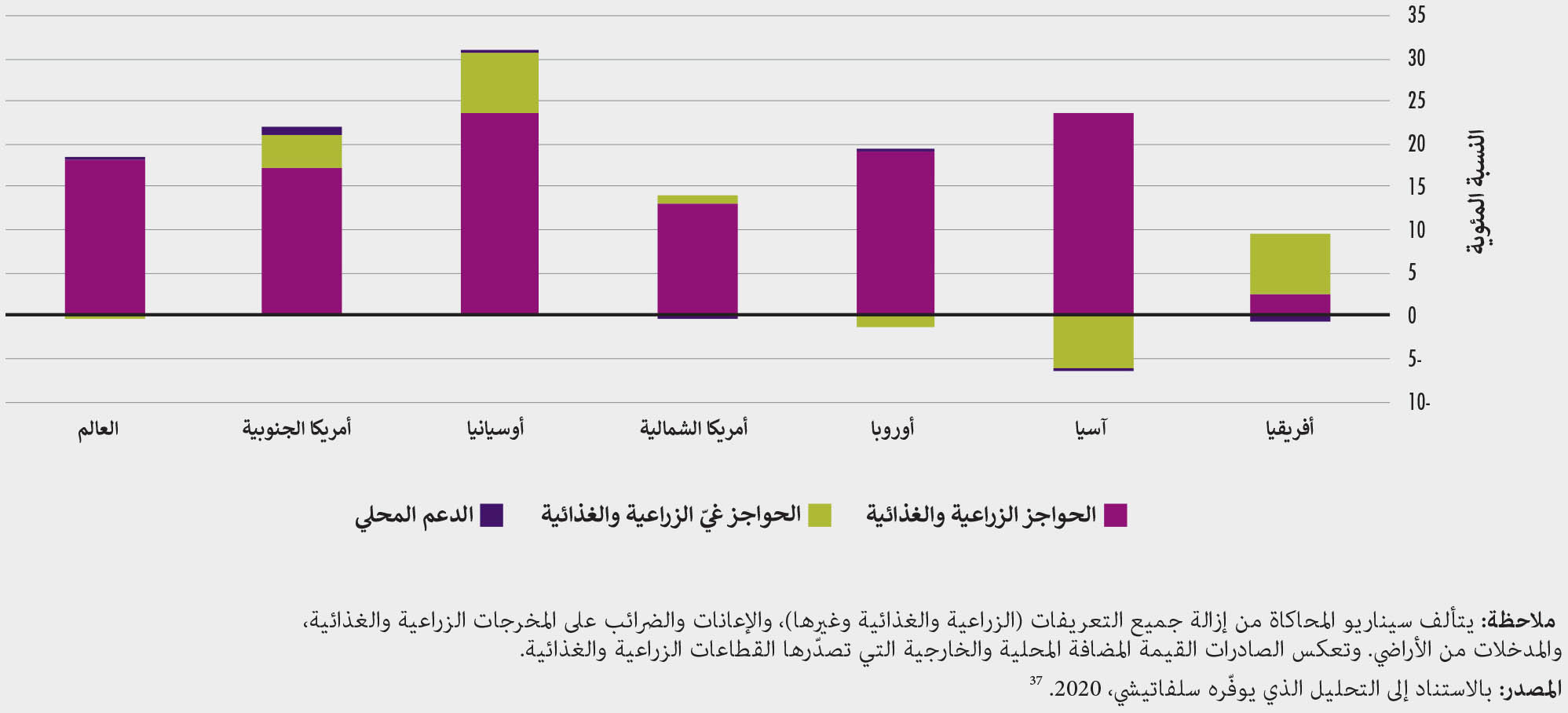 8.2 الآثار المتوقعة لإزالة التدابير المختلفة على مستوى السياسات على الصادرات الزراعية والغذائية الإجمالية، التغييرات في النسبة المئوية