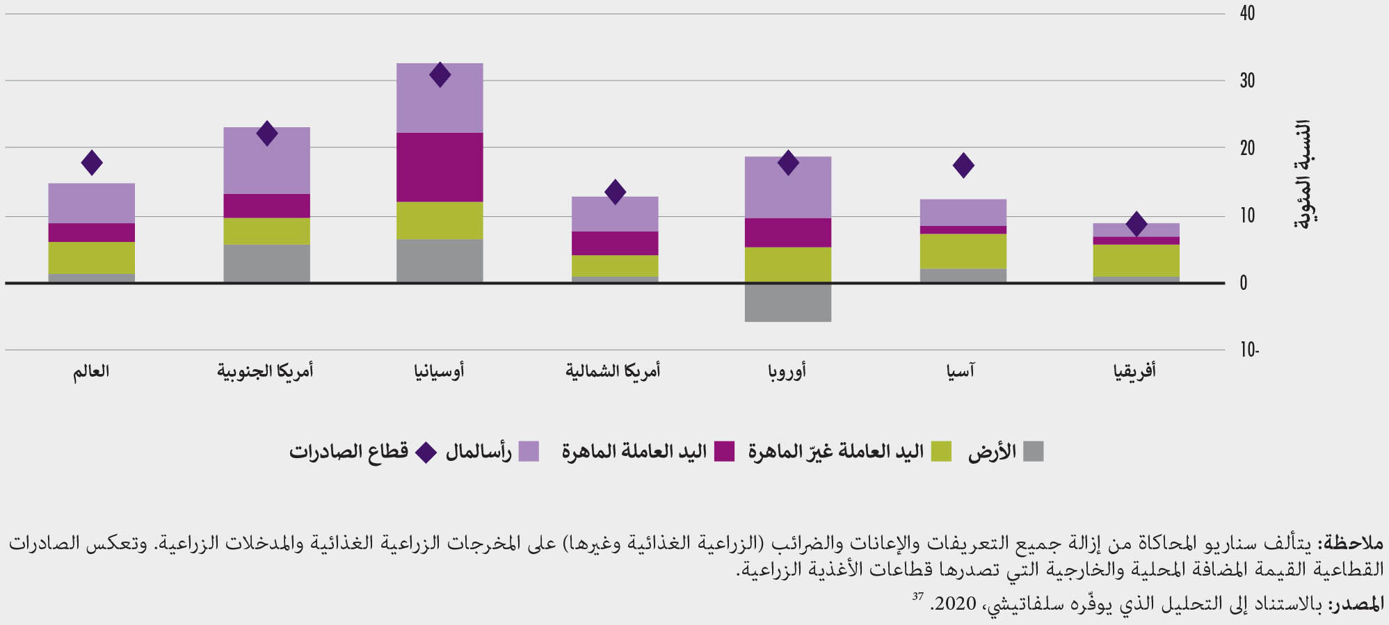 9.2 الآثار المتوقعة للانفتاح على التجارة على القيمة المضافة للمنتجات الزراعية والغذائية المصدّرة بحسب عامل الإنتاج، التغييرات في النسبة المئوية