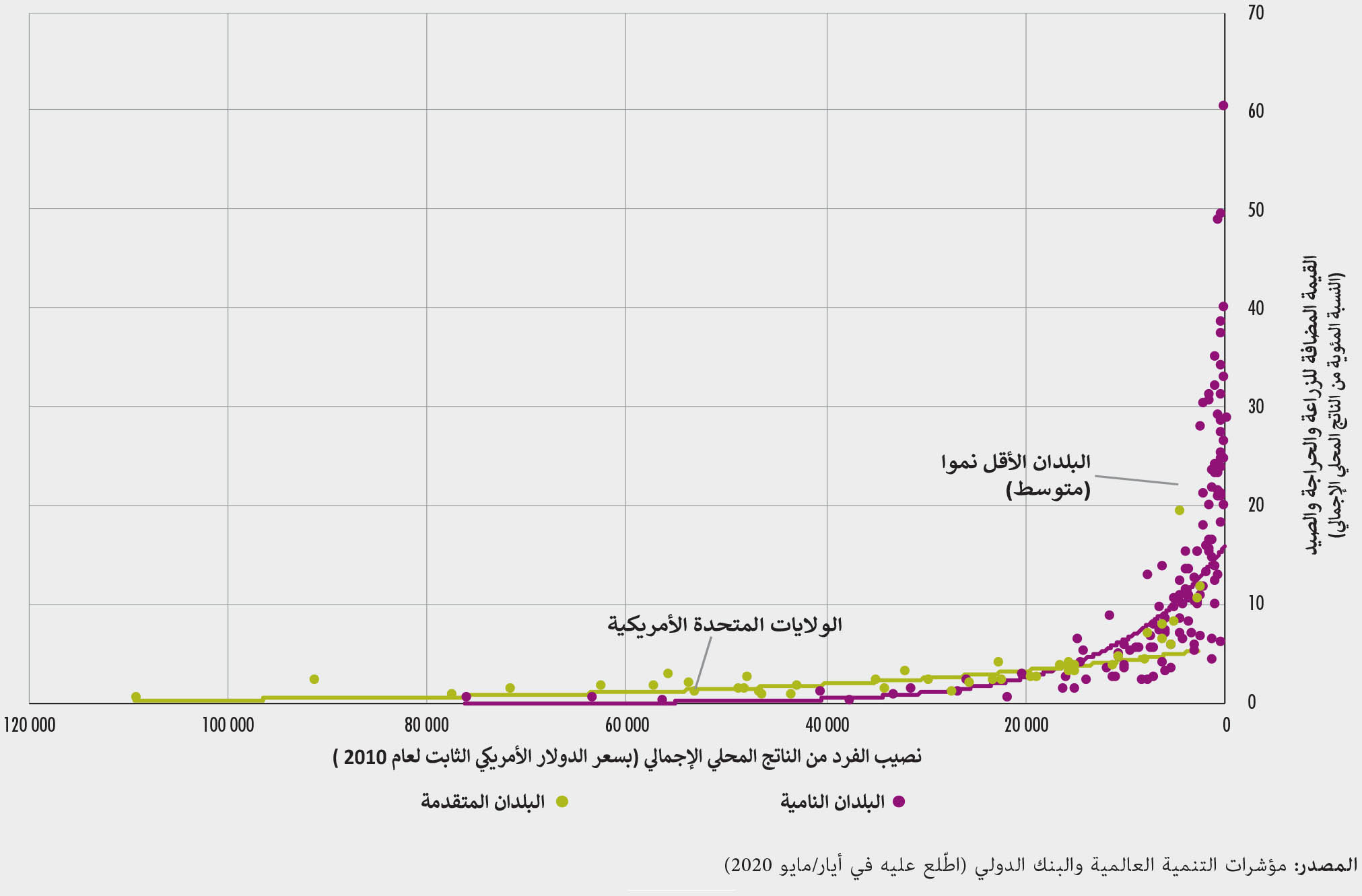 1.3 التحوّل الهيكلي في البلدان: حصة الناتج المحلي الإجمالي للزراعة ونصيب الفرد من الناتج المحلي الإجمالي في عام 2017