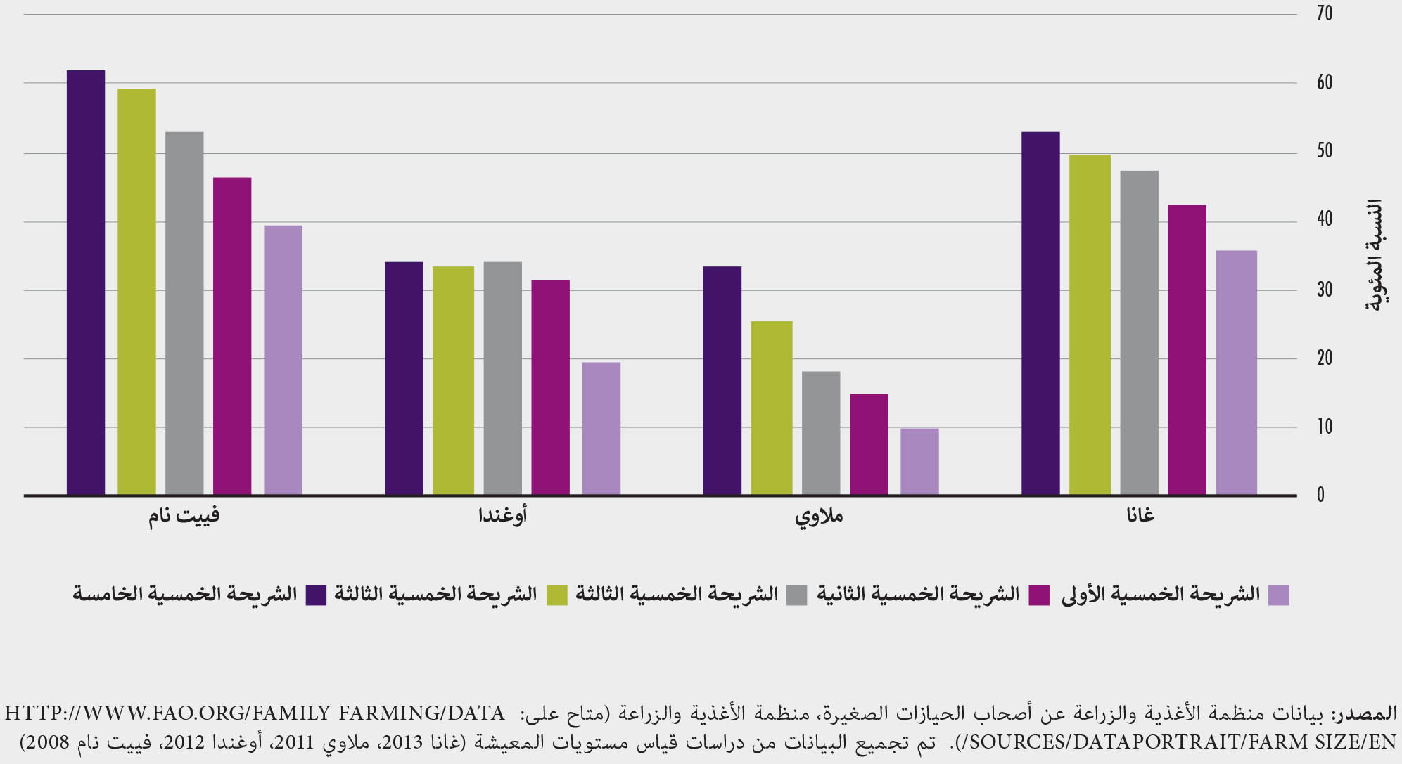 4.3 حصة الإنتاج الأسري المباع في الأسواق تبعًا لحجم المزرعة في غانا وملاوي وأوغندا وفييت نام على أساس الشرائح الخمسية