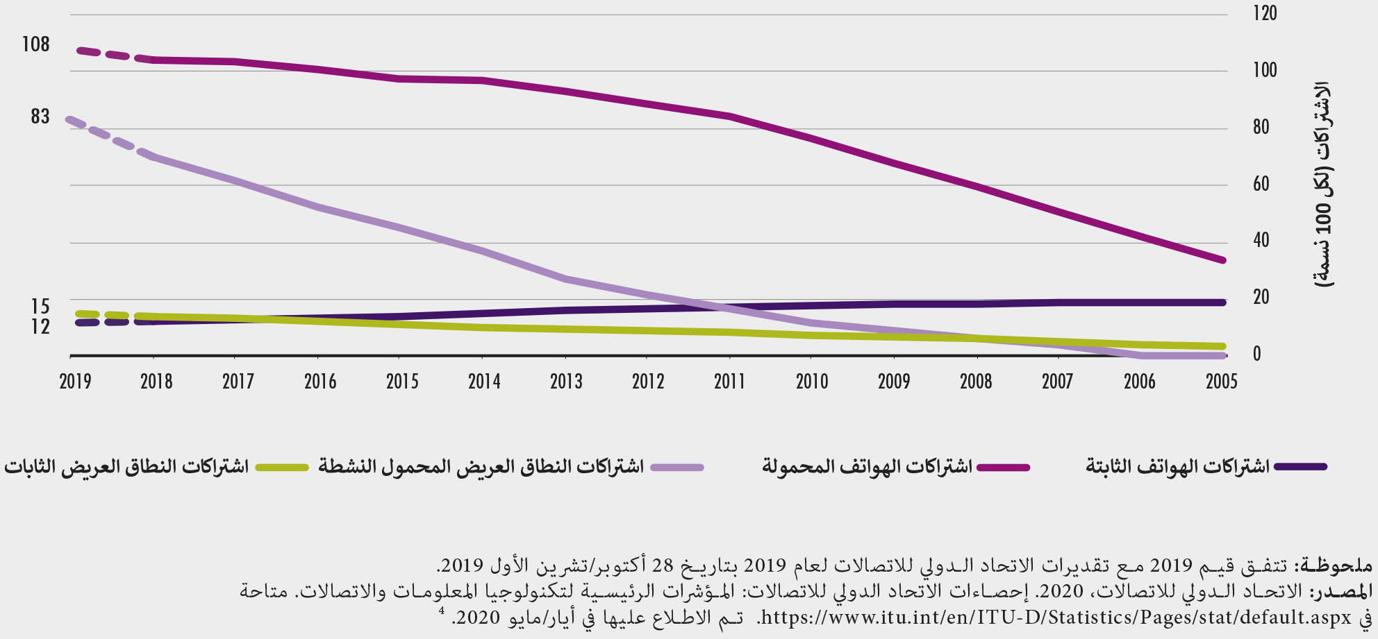 1.4 الاشتراكات العالمية في شبكات الهواتف الثابتة والمحمولة، والنطاق العريض الثابت والمحمول في الفترة 2005-2019 (لكل 100 نسمة)