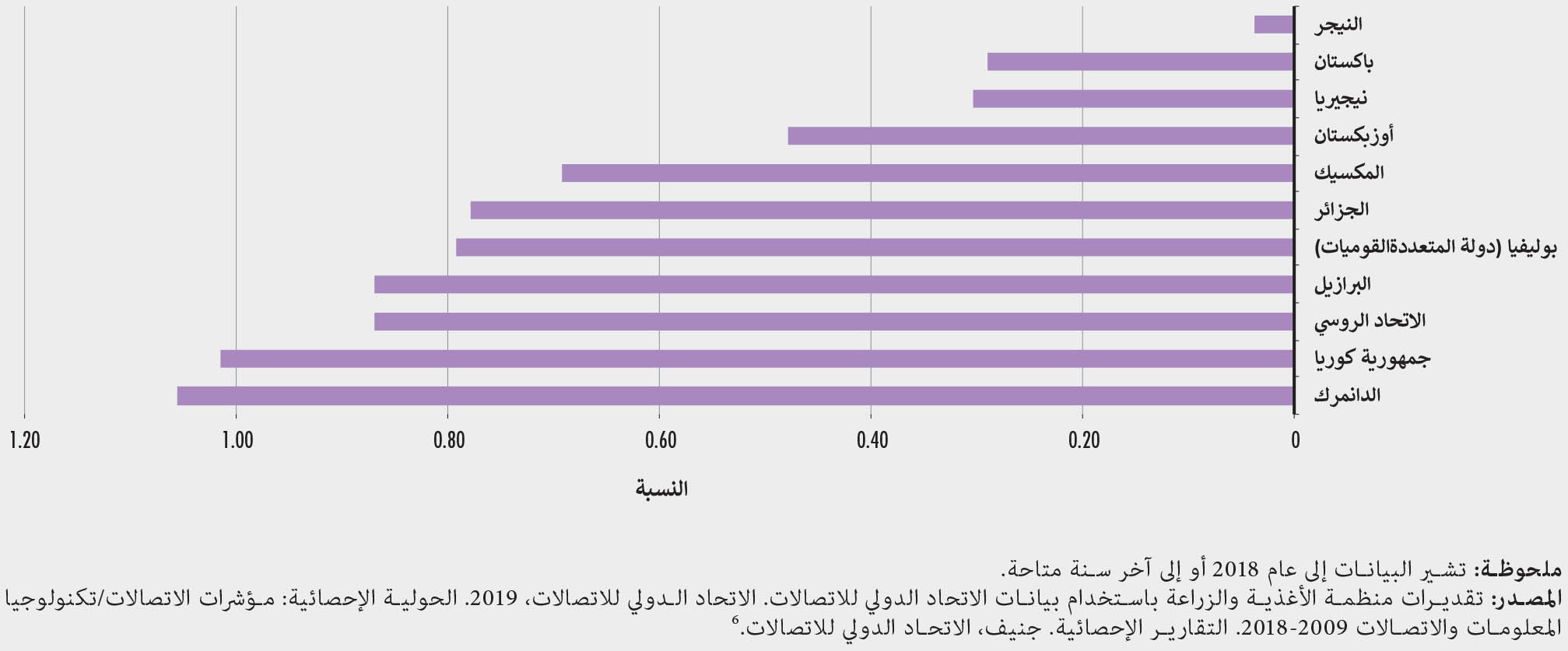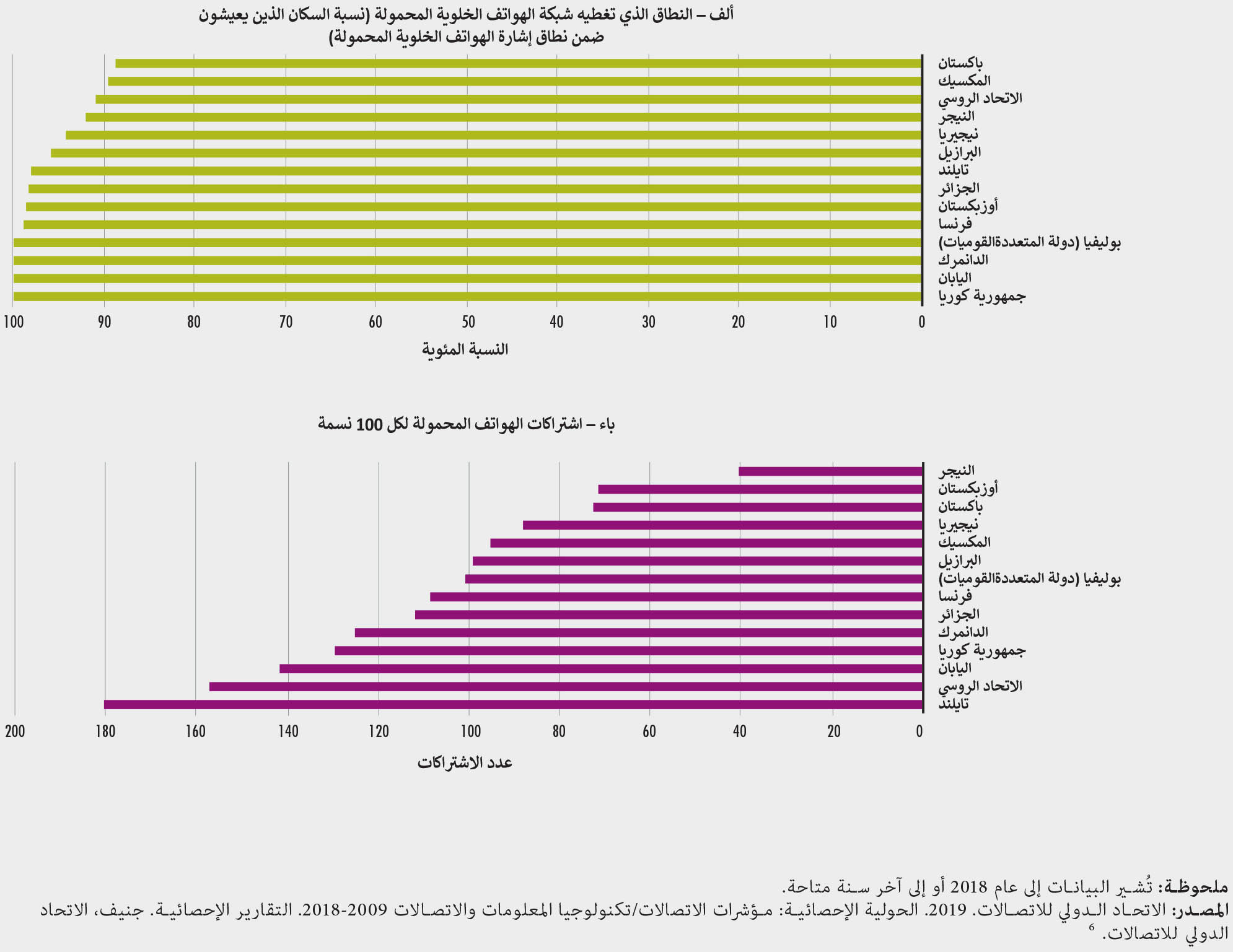 2.4 نسبة الحصول على الهواتف الخلوية المحمولة في مجموعة مختارة من البلدان، 2018