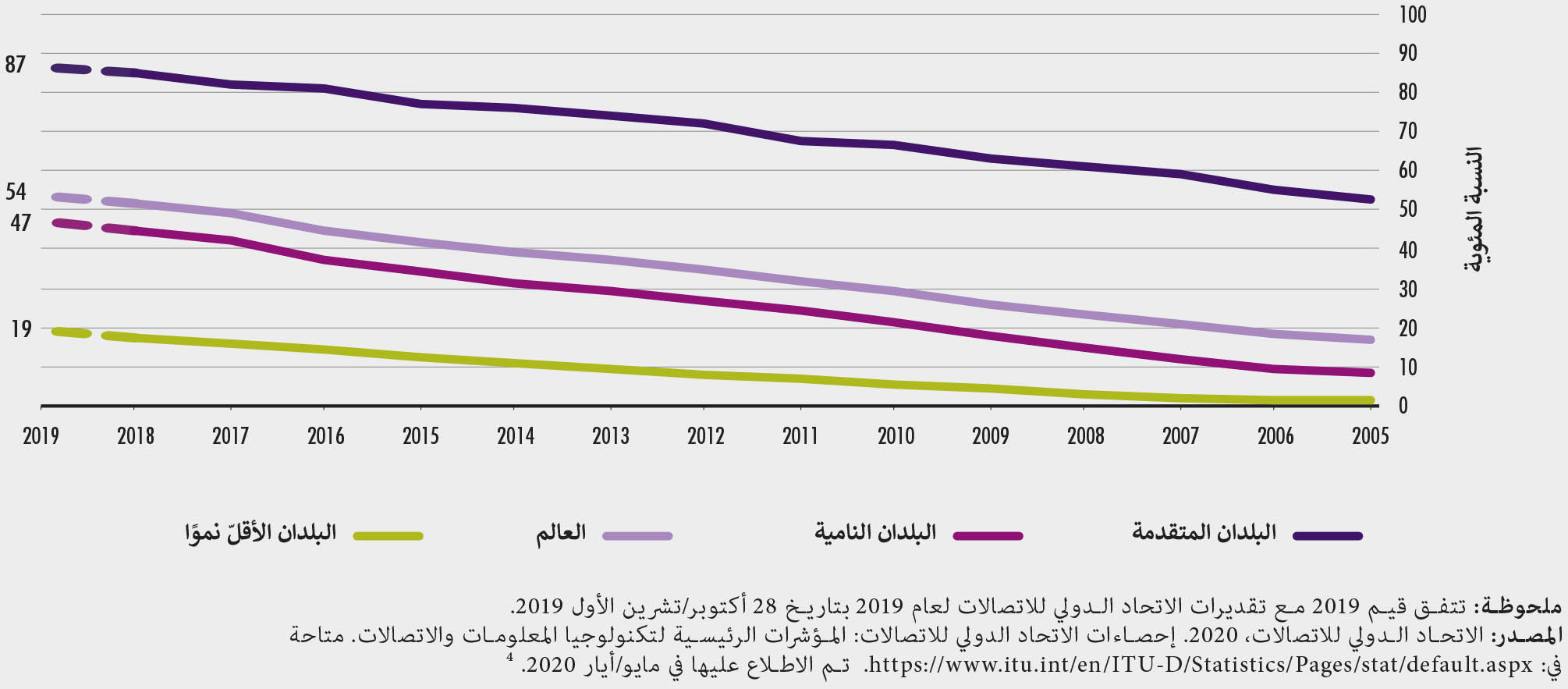 3. الاتحاد الدولي للاتصالات، 2019، Measuring digital development: Facts and figures. [ورد ذكره في 16 مارس/ آذار 2020]. https://www.itu.int/en/ITU-D/Statistics/Documents/facts/FactsFigures2019.pdf