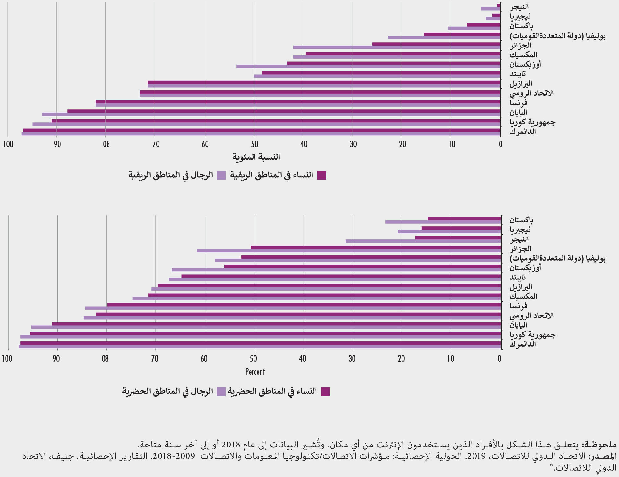 4.4 الأشخاص الذين يستخدمون الإنترنت في بلدان مختارة بحسب نوع الجنس والموقع، 2018 (بالنسبة المئوية)