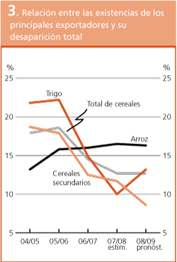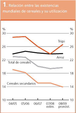 Indicadores de la FAO para la oferta y la demanda de cereales a escala mundialComo signo evidente de que en la nueva campaña (2008/09) la situación del mercado continuará siendo difícil, se prevé que en 2008/09 la relación mundial entre las existencias finales de cereales y su utilización tendencial alcanzará sólo el 19,7 por ciento, marginalmente superior al nivel más bajo en 30 años alcanzado en 2007/08 (19,4 por ciento). Entre los cereales principales, se prevé que la situación de los cereales secundarios (en particular el maíz) será la más difícil. Dado que la utilización total excederá de la producción mundial, se pronostica que la relación entre las existencias y la utilización de cereales secundarios descenderá a 13,9 por ciento, el nivel más bajo en 30 años. En cuanto al arroz, se prevé que la relación alcance el 23,9 por ciento, todavía relativamente bajo y casi sin modificaciones con respecto a 2007/08. Pero se prevé una recuperación, de casi un 3 por ciento, de la relación del trigo, a 26,6 por ciento. Según los pronósticos, el incremento previsto en la producción mundial de trigo en 2008 permitirá reponer las existencias y mejorar el suministro.