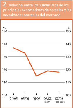 A pesar de la expectativa de una sólida recuperación de la producción de cereales en 2008 en aquellos países exportadores importantes que sufrieron recortes de la producción en 2007, se estima que en 2008/09 la relación entre sus suministros totales de cereales y las necesidades normales de mercado se mantendrá sin modificaciones en un nivel relativamente bajo de 118 por ciento. Ello representa un superávit de apenas 18 por ciento. Sin embargo, la razón principal de que este coeficiente se mantenga bajo es la producción de maíz en los Estados Unidos que, según los pronósticos, descenderá de forma pronunciada respecto del nivel sin precedentes del año anterior.