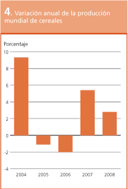 Según las estimaciones, la producción mundial de cereales aumentará un 2,8 por ciento en 2008, lo que representaría otro aumento relativamente sólido tras la producción sin precedente del año pasado, y un hecho positivo ante la difícil situación mundial de la oferta y la demanda. Pero, dado que las campañas de los cereales secundarios distan mucho de haber terminado en algunos de los principales países productores y las campañas principales del arroz se encuentran en una fase muy inicial en Asia, se trata de un pronóstico muy provisional y el resultado final dependerá de las condiciones atmosféricas de los meses venideros.