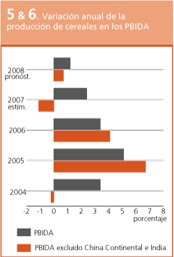 Aunque se pronostica que la producción de cereales de los PBIDA aumentará ulteriormente en 2008, la tasa de crecimiento, de sólo el 1,2 por ciento, representaría una disminución por tercer año consecutivo. Pero, a diferencia de 2007, si se excluyen China (Continental) y la India, que representan unas dos terceras partes de la producción total de cereales, se estima que en el resto de los PBIDA la producción de este año aumentará un 0,7 por ciento, una mejora marginal que constituye un rasgo positivo tras la merma del año pasado. Sin embargo, el crecimiento limitado de la producción de este año en esos países implica que continuarán dependiendo sobremanera de las importaciones para satisfacer sus necesidades de consumo en 2008/09, en un momento en que los precios internacionales de los cereales se mantienen a niveles muy altos, lo que representará también este año una carga excepcional para sus recursos financieros.