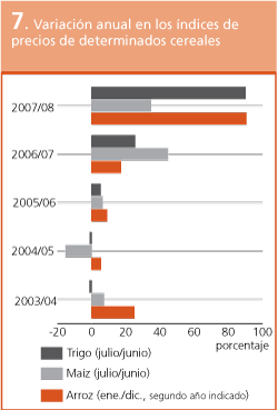 Dado el déficit de la producción de cereales en relación con la utilización total en 2007/08 y el descenso de las existencias, los precios de la mayoría de los cereales subieron de forma pronunciada y algunos siguen subiendo o se mantienen a niveles altos a pesar de las perspectivas mejoradas para la producción en 2008. A causa del aumento rápido de los precios internacionales del trigo, el índice del trigo aumentó un 90 por ciento en la campaña comercial 2007/08 (julio/junio) con respecto a 2006/07, después de haber subido un 25 por ciento en 2005/06. El índice del maíz aumentó un 35 por ciento en la campaña comercial 2007/08 (julio/junio), después de haber subido cerca de un 45 por ciento en la campaña anterior. Desde el comienzo del año (de enero a junio de 2008) el índice del arroz ha marcado un promedio superior en un 90 por ciento al del período correspondiente de 2007. En la campaña comercial de 2007 (enero-diciembre) el índice del arroz ya había subido un 17 por ciento en comparación con 2006.