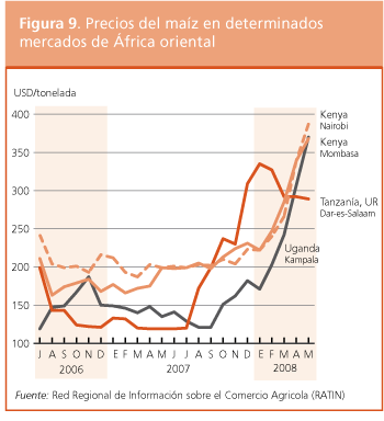 En la República Unida de Tanzanía, debido a una prohibición gubernamental de las exportaciones, a las importaciones de grandes cantidades de maíz y a unas perspectivas favorables para la cosecha de maíz que se está recogiendo ahora, en los últimos meses los precios al por mayor bajaron en Dar-es-Salaam, de suerte que el precio de mayo (289 USD por tonelada) era 46 USD más bajo que el precio máximo alcanzado en enero. En Uganda, a pesar de las previsiones de una cosecha normal, en mayo el precio del maíz había subido a 370 USD por tonelada, aproximadamente 200 USD más por tonelada que en enero, apenas cuatro meses antes.