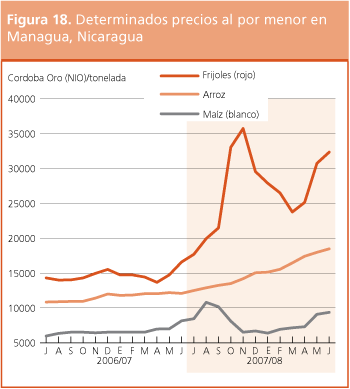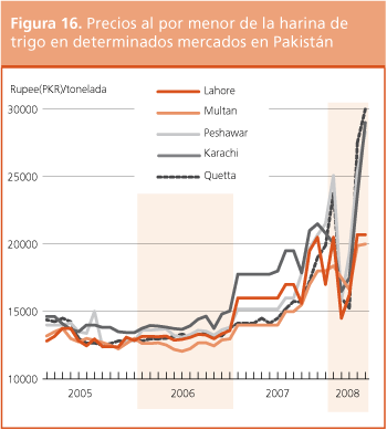 El 2 y 3 de mayo de 2008 el ciclón Nargis azotó Myanmar con vientos de hasta 200 km por hora, que arrasaron toda la región del delta Ayeyarwady (Irrawaddy) y la ciudad principal (y antigua capital) del país. Las cifras oficiales cifran el número de los muertos y desaparecidos en más de 130 000. Más de 2,4 millones de personas resultaron gravemente afectados, de los cuales más de 750 000 necesitan asistencia alimentaria inmediata. Las zonas más afectadas han sido las de los distritos de Ayeyarwadi, Bago, Mon, Kayin y Yangon. Muchas familias perdieron sus cosechas, reservas de alimentos, ganado, estanques piscícolas u otros bienes de producción. La situación de la seguridad alimentaria en el país, que ya era grave, debería empeorar mucho más ya que el ciclón ha afectado la fuente alimentaria del país, situada en la parte meridional. Al 23 de junio, se había entregado en las zonas afectadas asistencia alimentaria por un total de unas 17 000 toneladas. En China, un terremoto, el más violento de los últimos 30 años, azotó la provincia sudoccidental de Sichuan el 12 de mayo. A principios de junio, las víctimas se calculaban en más de 69 000 personas y los heridos en más de 374 000. Pero estos números podrían aumentar, porque todavía quedan unas 18 000 personas desaparecidas. Se estima que en total han resultado afectados 45,6 millones de personas, incluidos los 15 millones de personas evacuadas, de los cuales unos 5 millones están viviendo en viviendas precarias. Según estimaciones oficiales, otros 10 millones de personas aproximadamente están viviendo por debajo de la línea de pobreza como consecuencia del terremoto. La mayor parte de la población afectada por el terremoto depende críticamente de la agricultura para su subsistencia y muchos son vulnerables a la inseguridad alimentaria. En la República Popular Democrática de Corea, se está realizando a toda marcha el trasplante del arroz, actualmente la actividad agrícola más importante del país. Según los informes, el problema más urgente para la producción agrícola de este año es la falta de fertilizantes. La situación del suministro de alimentos sigue siendo inestable a causa de las inundaciones que devastaron los cultivos del año pasado. Se estima que el déficit de cereales para la campaña comercial 2007/08 (noviembre/octubre) es de alrededor de 1.66 millones de toneladas. Para mayo de 2008, en Pyongyang el precio del arroz había aumentado a un nivel máximo de 3 000 won por kg, casi el cuádruple del precio del mismo mes del año pasado. El precio del maíz está en torno a los 1 500 won por kg, cinco veces más alto que en mayo de 2007. El país tiene que depender de la asistencia exterior ya que su capacidad para importar comercialmente sigue siendo limitada por el mal funcionamiento de la economía y el reciente aumento en los precios de los alimentos. Los Estados Unidos prometieron suministrar al país 500 000 toneladas de ayuda alimentaria en los meses venideros y acaban de llegar los primeros envíos. Más de 300 000 personas de nueve distritos del lejano y medio oeste de Nepal están haciendo frente a una situación alimentaria inestable como consecuencia de las malas cosechas debidas a la sequía. Se trata de regiones del país ya crónicamente pobres debido a su escasa productividad y a un deficiente acceso a los mercados. Con el aumento de los precios, es probable que empeore la inseguridad alimentaria, situación que llegará a ser grave durante el período de carestía a partir de junio. El problema se ha agudizado por el aumento de los precios de los alimentos en todo el país. Al final de junio el tifón Fengshen arrasó el archipiélago de Filipinas, afectando a 11,2 millones de personas en 38 provincias. Se prevé que los daños a los edificios y a la infraestructura, incluidas por lo menos 111 454 casas, excedan de 24,1 millones de USD. Según los informes, sufrieron daños o quedaron destruidas unas 300 000 hectáreas de cultivos de arroz en la región de Visayas occidental y en otras 12 provincias. En Timor-Leste la inseguridad alimentaria debería continuar, debido a las consecuencias de la constante inestabilidad así como del alto grado de dependencia del país respecto de las importaciones de cereales. Debido a los precios altos, el país está haciendo frente a dificultades cada vez mayores para conseguir en el mercado mundial las cantidades de arroz suficientes para satisfacer las necesidades de importaciones. El número de las personas con inseguridad alimentaria o muy vulnerables a la inseguridad alimentaria ha aumentado significativamente debido a los disturbios civiles de 2006, que causaron el desplazamiento de 100 000 personas, de las cuales alrededor de 70 000 huyeron de Dili para buscar refugio en los distritos rurales al amparo de sus parientes. El índice elevado de desempleo, especialmente en los distritos rurales (80 por ciento), representa otro factor de inestabilidad social y de inseguridad alimentaria. En Bangladesh, todavía se están ejecutando operaciones de socorro humanitario en gran escala destinadas a prestar asistencia a los 8,9 millones de personas más perjudicadas por el ciclón Sidr, que el 15 de noviembre afectó hasta 30 distritos. La merma de la producción arrocera de 2007 y el aumento de los precios de los alimentos desde 2007 (Figura 14) están repercutiendo considerablemente en la seguridad alimentaria de los grupos vulnerables tanto de las zonas urbanas como rurales. En Sri Lanka, la seguridad alimentaria del país ha continuado viéndose afectada por el recrudecimiento del conflicto civil, así como por el alza de los precios de los cereales (Figura 15). Desde el comienzo de 2008, unas 5 000 personas murieron en los enfrentamientos y la situación de la seguridad alimentaria ha empeorado. En Colombo, los precios del arroz y de la harina de trigo aumentaron en junio de 2008 en un 67 por ciento y 75 por ciento, respectivamente, comp