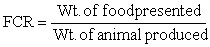 The efficiency of a feed is normally measured by the amount necessary to produce a unit weight of fish. This is called the feed conversion ration (FCR). The feed conversion ratio is the unit weight of feed given, divided by the live weight (or wet weight) of animal produced.