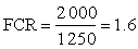 For example, if 1 250 kg of fish were produced (harvested) from a pond to which 2 000 kg of pelleted feed had been presented during the growing cycle, the FCR would be