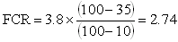 Often the FCR is written 1.6:1 (i.e., 1.6 units of feed are necessary to produce 1 unit of fish). The higher the value of the FCR, the less efficient the feed is. For example, a feed which has an FCR of 2.2:1 is worse (less efficient) than one which has an FCR of 1.6:1. Moisture levels in the animal or in the feed are not normally taken into account when the FCR of a feed is calculated. This means that wet or moist feeds automatically have much higher FCR's than dry feeds because so much of the feed consists of water. This does not mean that they are less efficient, simply that you should compare like with like. Moist feeds are normally proportionately cheaper than the equivalent dry feeds, if made on the farm. Strictly it is only possible to compare the FCR of a moist diet with that of another diet of similar moisture content unless a further calculation is done. To compare moist feeds with dry diets the FCR's must be reduced to a common level, either to a dry matter basis or to an assumed 10% moisture basis 1/. For example, let us assume that the FCR of a dry feed is 2.3:1 and that of a moist feed is 3.8:1. We know that the moisture content of the moist feed is 35%. It is reasonable to assume (since we do not know it and most 'dry' feeds are in this range) that the dry feed has a moisture content of 10%. Therefore the FCR of the moist feed can be brought to a comparable level as follows: