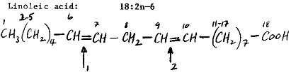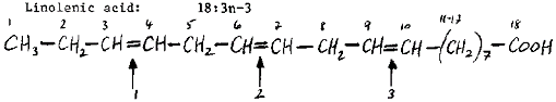 Those fatty acids which have their first double bond on the third carbon atom are known as the 'n-3' series 1/ or the 'linolenic' series after the name of the fatty acid in the series with 18 carbon atoms in its chain. Similarly, those which have their first double bond on the sixth carbon atom are known as the 'n-6' series 2/or the 'linoleic series. It is essential to notice the difference (which is only the addition of the letter N) between the two words LINOLENIC and LINOLEIC. This similarity causes a great deal of confusion and printing errors (not, I hope, in this manual!).