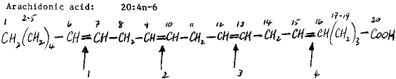 In the designation 20:n-6, for example, '20' means that there are 20 carbon atoms in the chain. '4' means that there are four carbon-carbon double bonds (the double bond is shown as a = sign and the carbon atom is shown as C). n-6 means that the first double bond, numbering from the methyl (CH3) end, occurs after the sixth carbon atom in the chain. Myristic acid (14:0) has fourteen carbon atoms but no C=C double bonds. Arachidic acid (20:0) also has no double bonds. Linolenic acid (18:3n-3) has eighteen carbon atoms and three double bonds, the first of which appears on the third carbon atom. Linoleic acid (18:2n-6) has two double bonds and the first occurs on the sixth carbon atom. And so on.