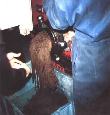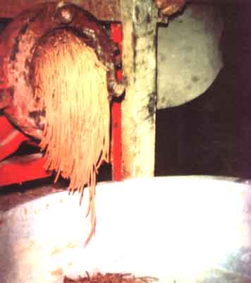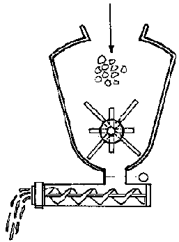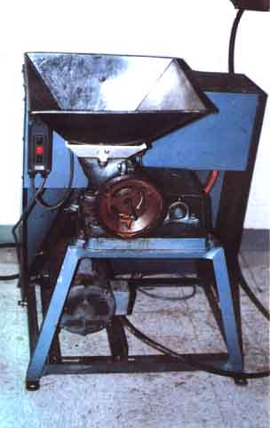 The same general rules apply to the extrusion of a mixed feed from a mincer as apply to the mincing of raw materials. Choose the die hole size for the feed which you are making. The rate of production will decrease as the die hole selected gets smaller. Don't overload the mincer (try to force too much feed through it at once). The material that is being fed into the top of the mincer is very sticky and sometimes it does not drop into the mincer screw very easily. Some mincers have an additional feeding screw which helps to overcome this problem. Most simply supply a special tamping rod (usually made of plastic) for pushing the material into the screw. This device, and the mincer, should be designed so that the tamping rod cannot actually come into contact with the screw itself. My experience is that, if such a device is provided, it quickly becomes used for other purposes and gets damaged or lost. The next stage is that the operators of the equipment look for other things with which to poke the feed into the mincer screw. Knives, screwdrivers, metal rods and hands seem to be the most common solutions. This practice is extremely dangerous for the operator and the equipment. It can lead to severe injury and/or the shearing of the screw and the failure of the equipment. If you must use something to help feed the mincer, make sure that it is a soft piece of wood and attach it to the frame with a piece of string.