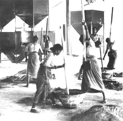 The labour involved in feed manufacture is mostly needed for moving ingredients and finished compound feed from one part of the plant to another. In small plants, moving feed by hand between different pieces of equipment will also be necessary. It is only efficient to have full-time labour employed for the feed plant if the mill is going to be in operation all day, every day. It is difficult to ensure regular operation of a dry pellet mill which is manufacturing for only one production unit (your farm) since the smallest equipment available may produce more than the average daily requirement of feed. There is therefore a tendency to make feed intermittently and draw feed from stock on a daily basis. The result is that the plant and its labour force may be standing idle much of the time. Moist feed requires daily manufacture but the operation need not take all day. Some farms find that they are able to use the same labour force to feed the fish as to make the feed itself. Most of the work in the feed mill can therefore be done by drawing labourers from the general pool of labour available on the farm. It is essential to have a full-time foreman and a deputy, who is responsible solely for feed manufacture, raw material intake, quality control, storage, etc.