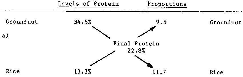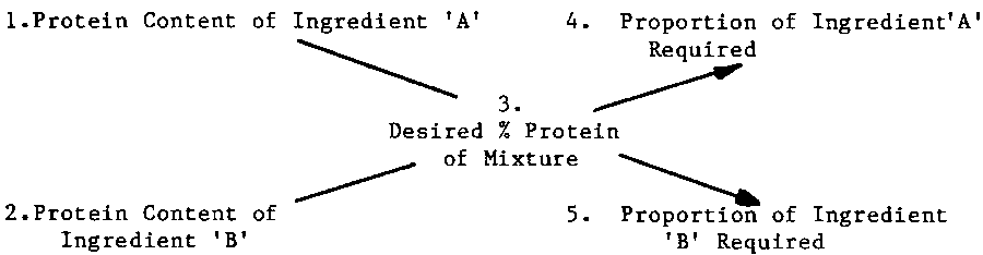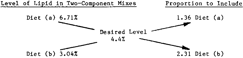 For the purpose of the following examples to be worked through in demonstrating how formulation is done, I have selected a very simple diet -initially to consist of only three ingredients - and a theoretical diet specification. For simplification I am also going to use only two analytical characteristics - the protein and the lipid level. I am also going to assume that, of these three ingredients, one which is of known nutritional value exists locally and is of acceptable cost. The formulator in the example has therefore already decided, on the basis of past experience, on a minimum inclusion rate for it. Thus the amount of this ingredient is already fixed. Let us assume that he has four other ingredients to select from.