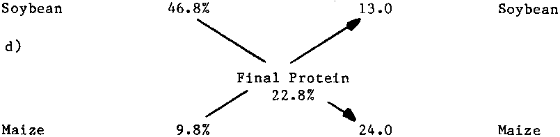 For the example, I am assuming that the formulator (nutritionist) has made up his mind, from past experience, that mermaids must have a minimum of 10% fish meal in their diet. The inclusion level of this ingredient in the diet is therefore fixed - the fish meal will thus contribute 0.6% lipid, 5.5% protein and US$ 60/kg to the final ration respectively. This can therefore be entered on the diet formulation worksheet (Table 18). Having defined (for this example) that there shall be only two other ingredients, the nutritionist decides to select one high protein ingredient (groundnut or soybean) and one low protein ingredient (rice bran or maize meal). This is because it is already obvious to him that the dietary protein requirements for mermaids cannot be matched if all three ingredients are high in protein or if the remaining two, after fish meal (at a fixed level of 10%), are low in protein. This can be demonstrated as follows. The dietary protein requirement is 26%. The fish meal, at 10% of the diet, will provide 5.5% protein to it. If the remaining 90% of the diet consists of either maize meal (9.8) protein) or rice bran (13.3% protein), or any combination of the two, the final protein content of the diet cannot be high enough: